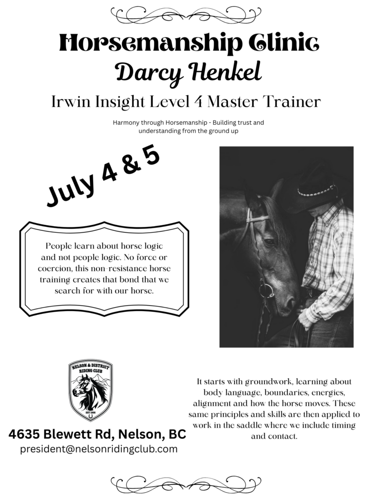 July 4th & 5th: Horsemanship Clinic with Darcy Henkel 2 day clinic $150. “Harmony through Horsemanship” – Building trust and understanding from the ground up. Contact info@nelsonridingclub.com for more details. https://docs.google.com/forms/d/e/1FAIpQLSed78GgzJT0f3SohrdRW6Vdg0n8THKyQTsBSJqT6cbaKd_3Sw/viewform